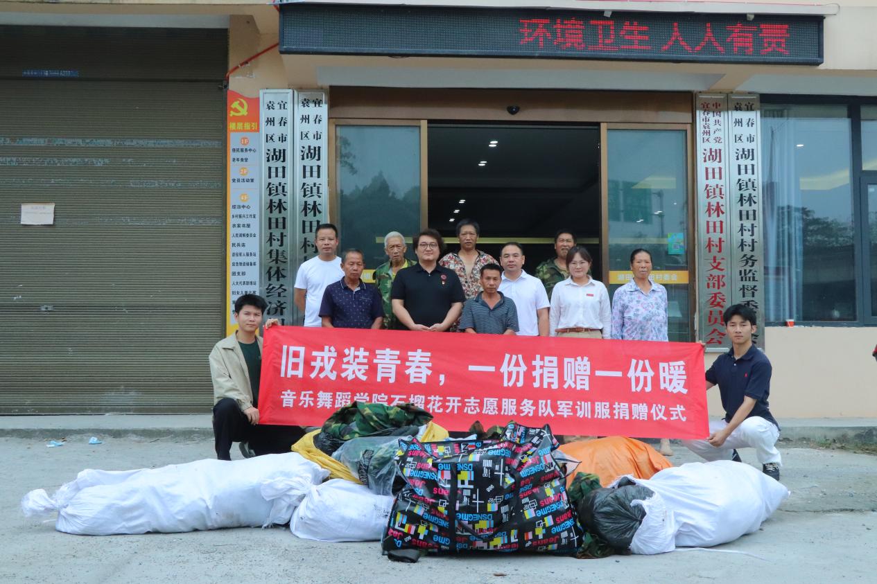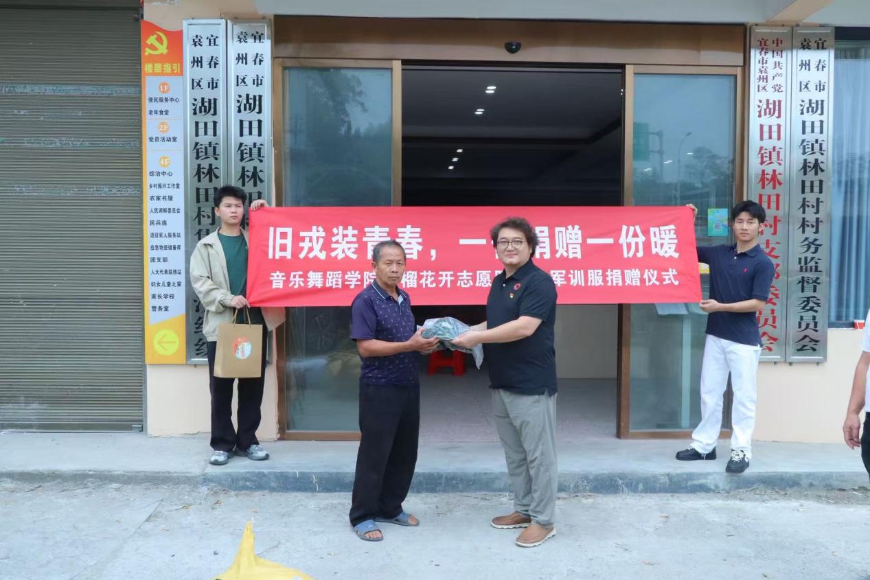 本站讯(学生记者 袁宇轩)近日,音乐舞蹈学院石榴花开志愿服务队在湖田镇林田村举行了一场充满温情的军训服捐赠仪式,院党委书记李磊带着学生以“旧戎装青春,一份捐赠一份暖”为主题,为居民送去关怀与温暖。