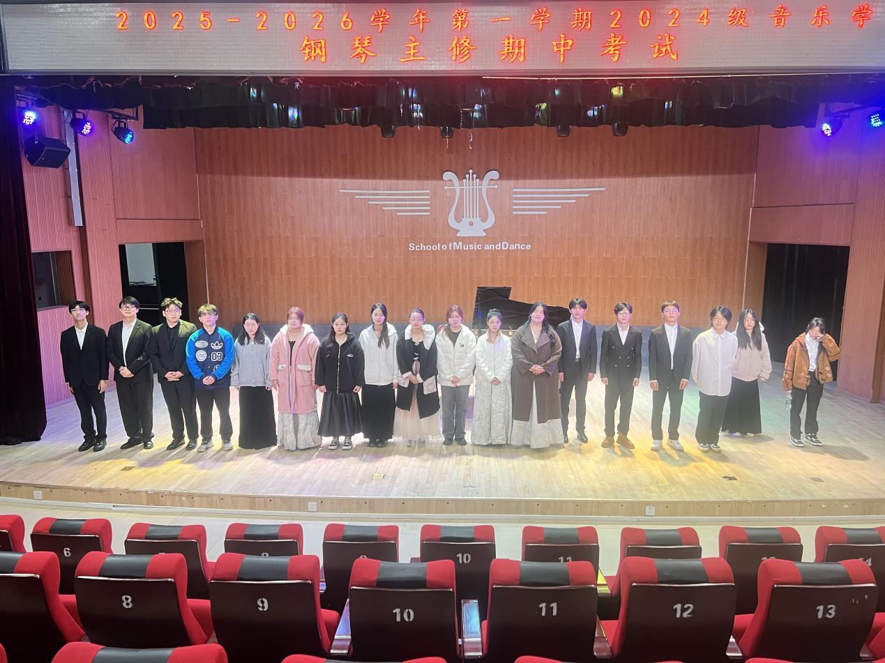 为全面检验音乐学专业学生的艺术素养与实践能力,深化理论教学与艺术实践的融合,音乐舞蹈学院钢琴教研室于2025年11月10日-28日,成功举办了2025-2026学年第一学期期中考试暨艺术实践周活动。本次活动以“琴音逐梦,校韵同辉”为主题,23级、24级、25级全体音乐学专业学生参与其中,在一系列专业考核与舞台展示中,集中展现了扎实的学习成果与昂扬的专业风采。
