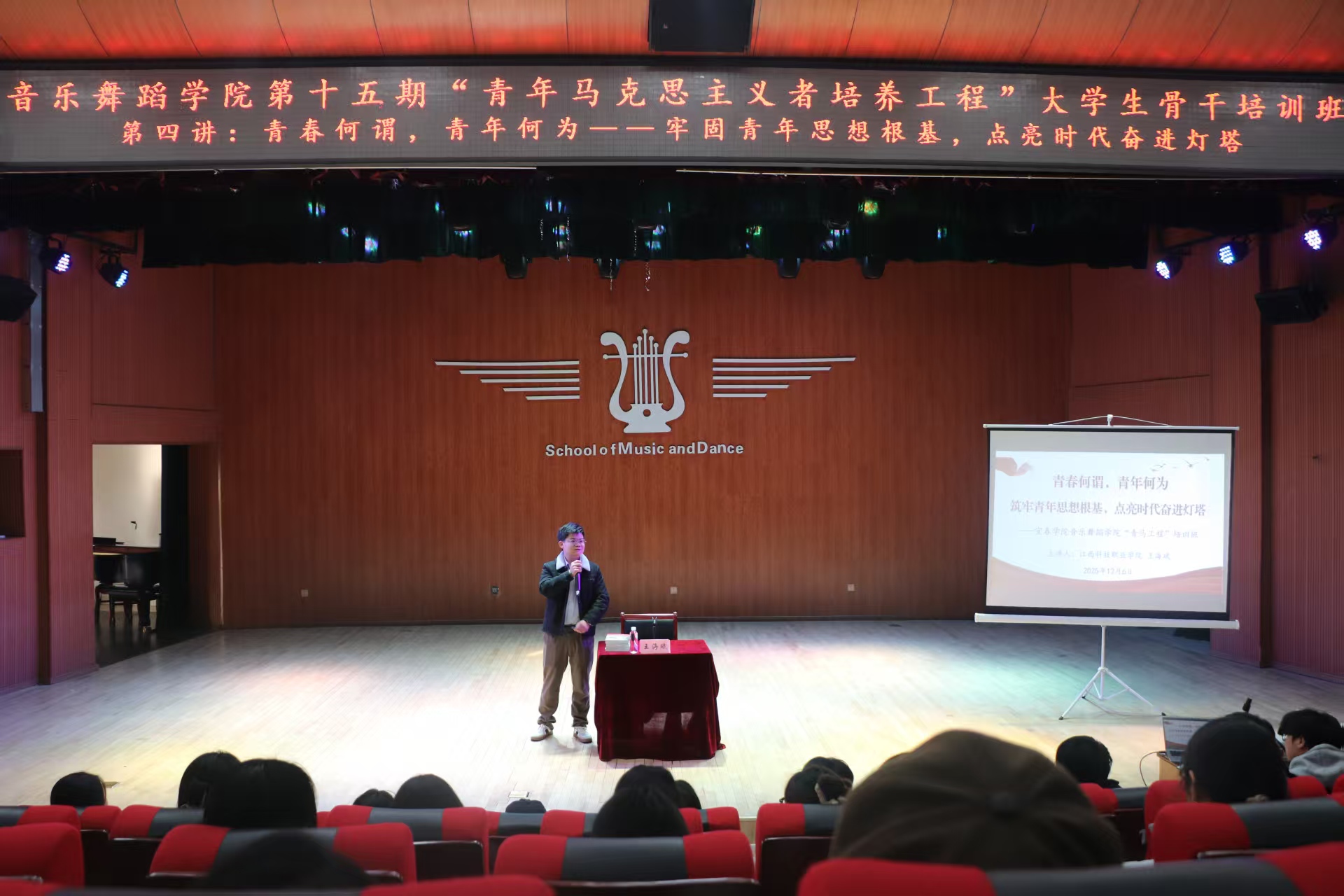 本站讯(学生记者 温乐花)12月6日下午,音乐舞蹈学院音乐厅内思想汇聚、氛围浓厚,第十五期“青年马克思主义者培养工程”大学生骨干培训班第四讲如期开讲。本次讲座以“青春何谓,青年何为——牢固青年思想根基,点亮时代奋进灯塔”为主题,特邀江西科技职业学院党委组织部部长王海斌主讲,学生工作办公室(团委)主任吴丽芳出席,全体学生骨干、入团积极分子及各班心理委员到场聆听学习。