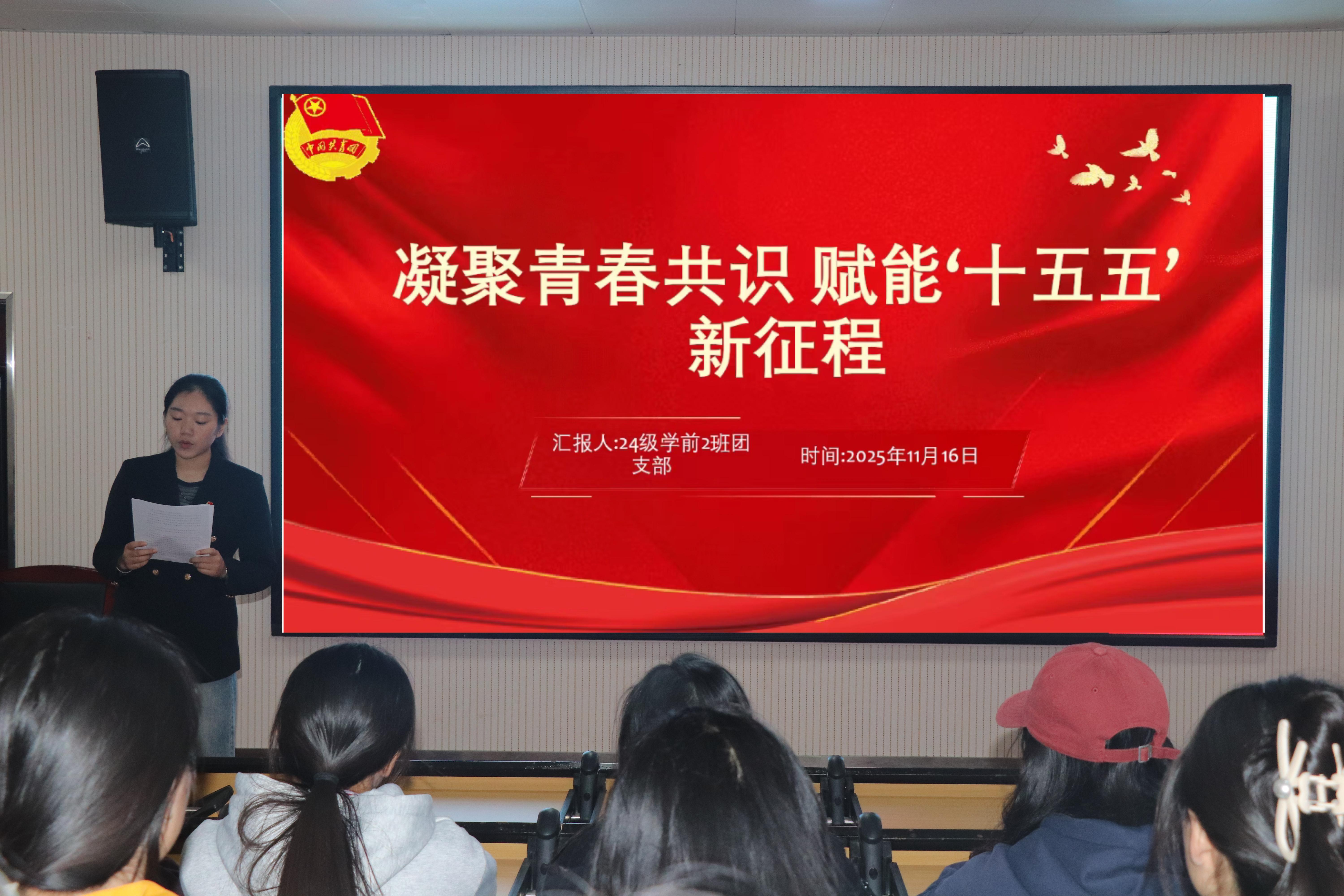 本站讯(学生记者 冷若云)为深入学习领会党的二十届四中全会精神,引导广大团员青年准确把握“十五五”时期国家发展的目标任务与时代使命,11月16日,我院24学前二班团支部在电教楼公共音乐教室开展示范团日活动。24学前二班全体学生、学院各团支部团支书参加活动。本次主题团日活动的主题是“学习党的二十四届四中全会精神,青春建功‘十五五’主题团日活动”