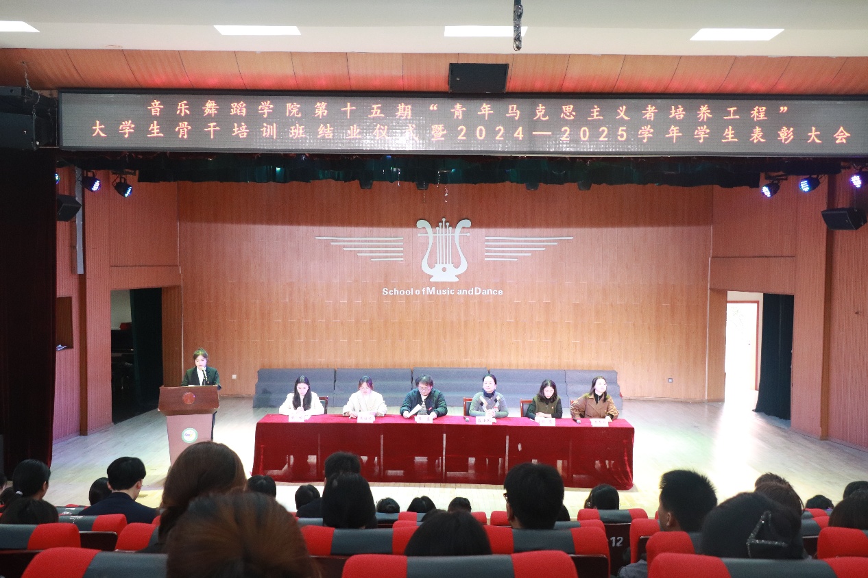 本站讯(学生记者 李佩瑶)12月11日,在艺术楼音乐厅举行第十五期“青年马克思主义者培养工程“大学生骨干培训班结业仪式,同时为2024-2025学年表现优异的同学们表彰授奖。院党委书记李磊,党委副书记聂小凤,学生事务办公室(团委)吴丽芳,学生党支部书记熊鹰,综合办公室袁哈,辅导员朱慧玲出席本次结业典礼暨表彰大会,全体培训班成员参加。