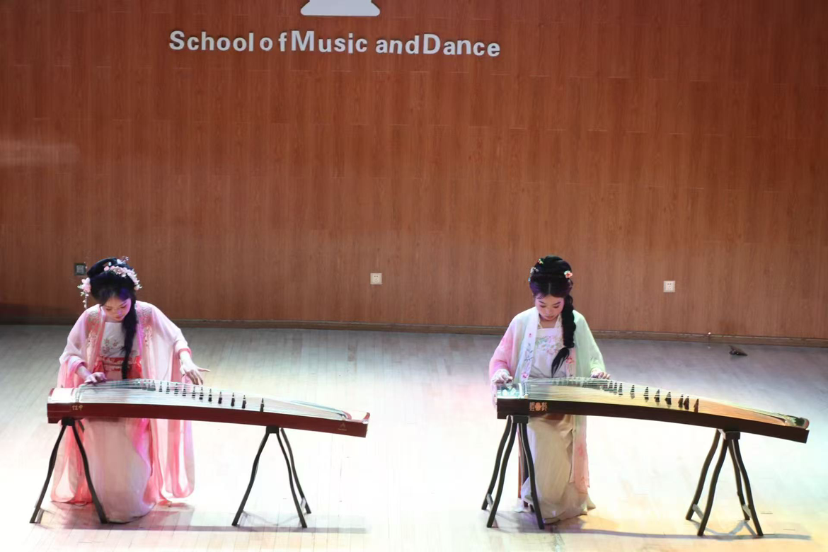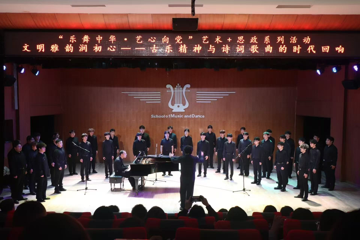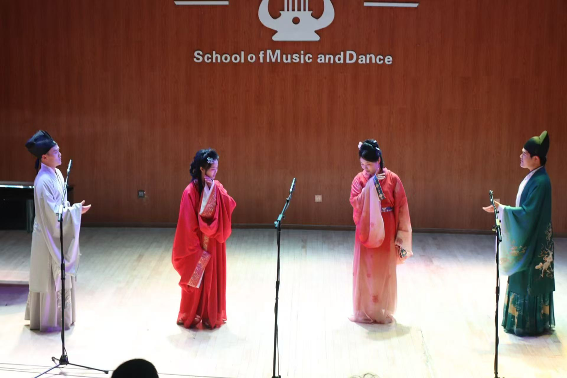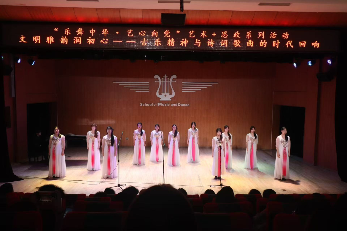 微党课结束后,主题音乐会随即上演。节目紧扣党课所传递的精神脉络,将“修身、齐家、治国、平天下”的理念转化为可听可感的艺术表达。男女声二重唱《越人歌》、古筝齐奏《临安遗恨》、双人舞《锦瑟》、女声小组唱《红豆词》、琴歌《阳关三叠》、群舞《唐印》及大合唱《精忠报国》等节目依次登场,涵盖声乐、器乐、舞蹈等多种形式。师生以精湛技艺和饱满情感,将古乐精神与诗词歌曲中的家国情怀娓娓道来,赢得现场观众阵阵掌声。