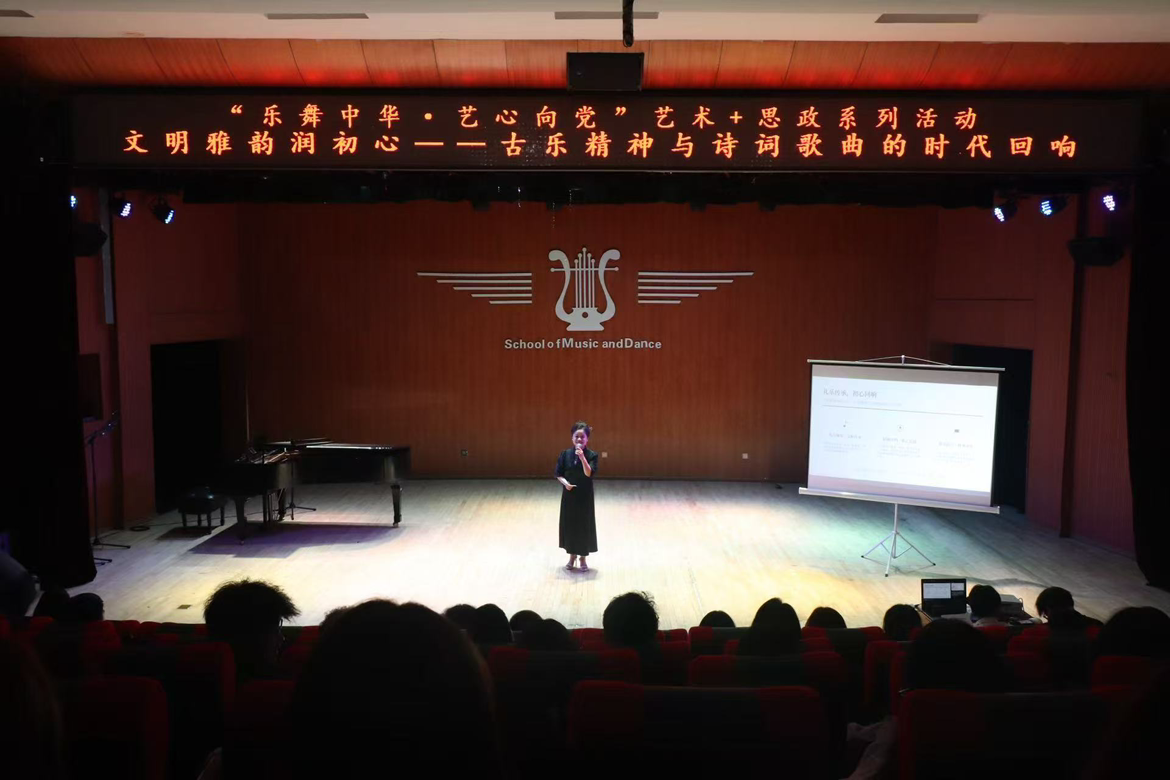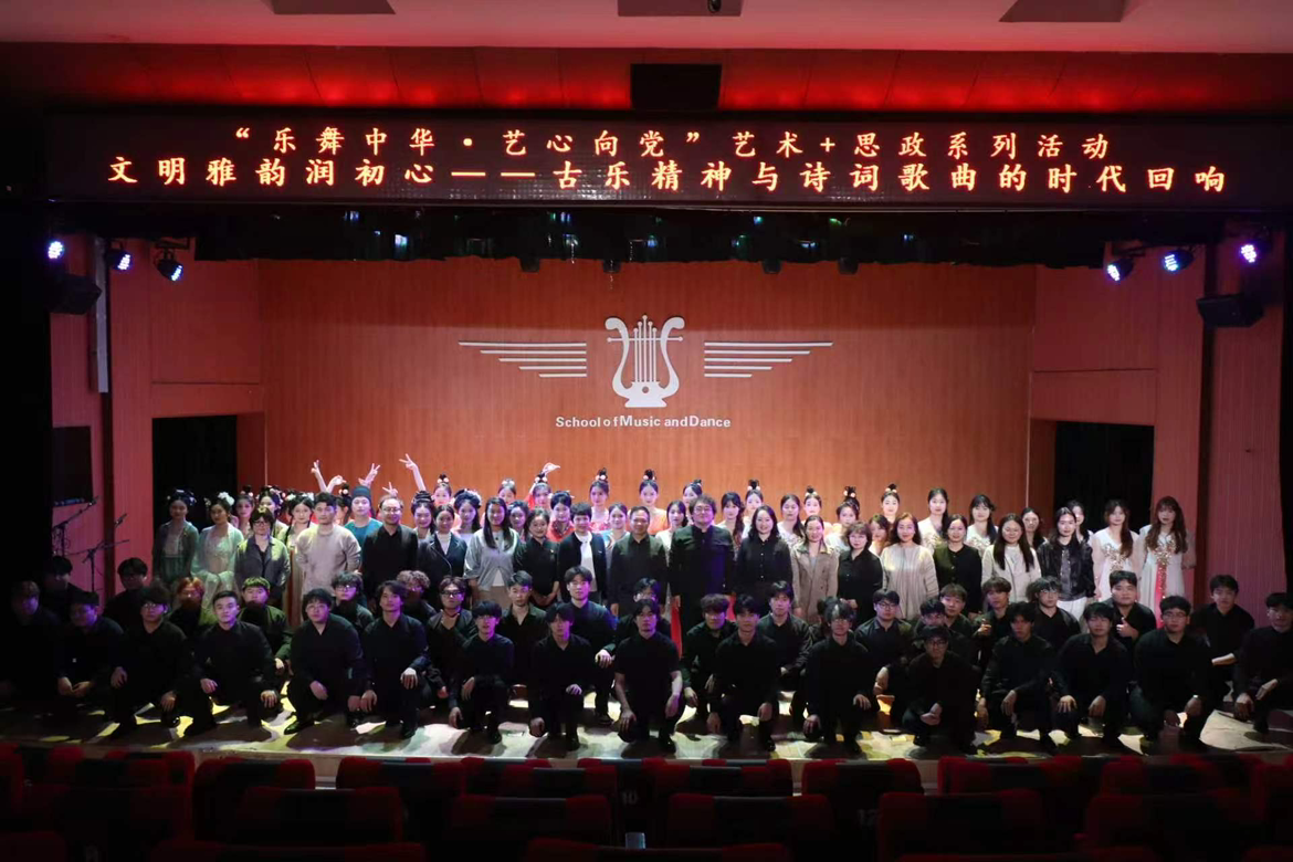 本站讯(记者 袁哈 刘平慧)为深入推动“艺术+思政”教育融合创新,4月14日晚,宜春学院音乐舞蹈学院在艺术楼音乐厅举办“乐舞中华·艺心向党”艺术+思政主题活动首场演出——《文明雅韵润初心——古乐精神与诗词歌曲的时代回响》。活动采用“微党课+主题音乐会”的形式,将理论阐释与艺术展演有机融合,为师生带来一堂生动的“舞台上的思政课”。